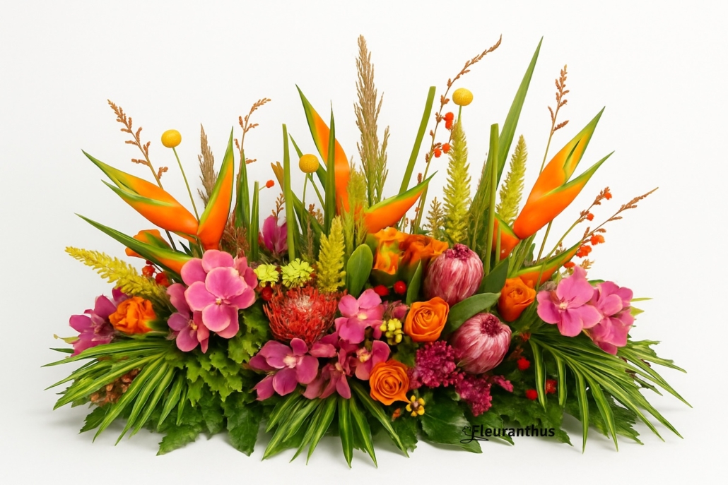 Het Bloementuin Rouwstuk Enschede is gemaakt met veel verschillende kleuren bonte, vooral tropische bloemen en materialen van het seizoen. In dit bloemstuk zit ook de Heliconia gecombineerd met donker. roze orchideeën. Dit stuk wordt boeiend door de bijzondere kleuren combinatie met verschillende kleuren roze en oranje bloemen.