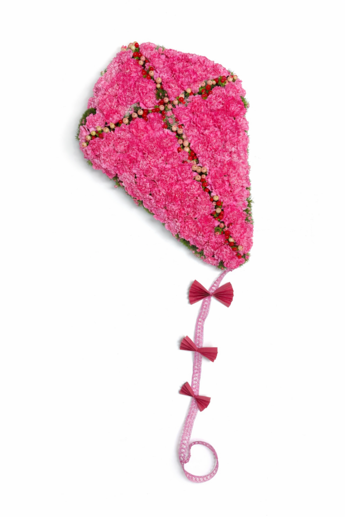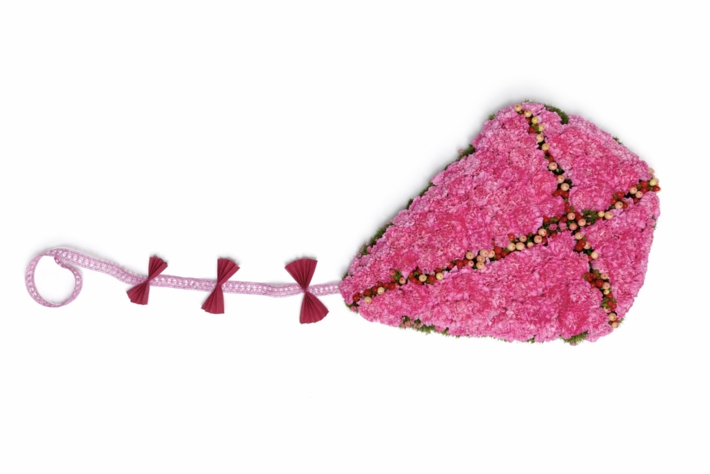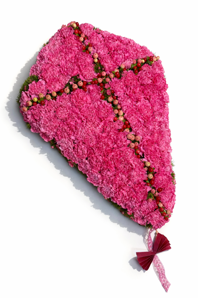 Optioneel is dit bloemstuk in de vorm van een vlieger in heel veel kleuren te maken waardoor het goed bij de persoonlijkheid past. Hier vindt je bloemenvliegers gemaakt van bloemen voor bij een uitvaart.