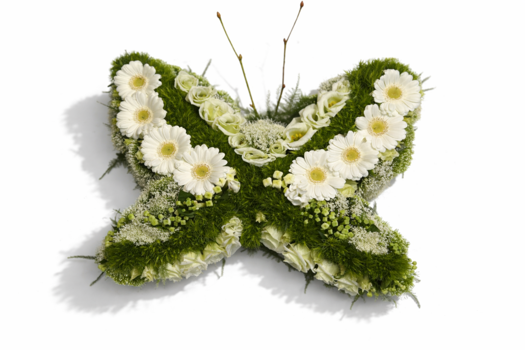 De Bloemenvlinder White Memory is gemaakt met witte gerbera’s en allerlei wit groene bloemen van het zeisen.