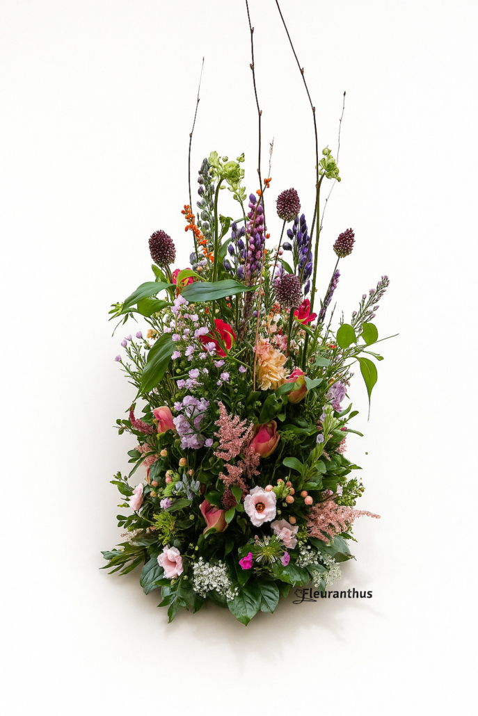Het Rouwbloemstuk Vlindertuin: Een liefdevol rouwbloemstuk in natuurlijke tuinstijl, samengesteld met een weelderige mix van rosé en paarse plukbloemen en kleurrijke tuinbloemen. Het stuk straalt rust, warmte en eenvoud uit — alsof het zo uit een zomertuin is geplukt. Zachte tinten en losse, organische vormen geven dit arrangement een eerlijke, pure uitstraling. Elke bloem vertelt zijn eigen verhaal, samen vormen ze een prachtig eerbetoon aan een leven vol liefde voor de natuur.