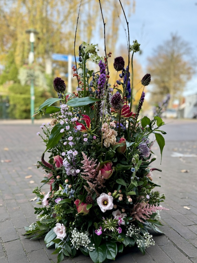 Optioneel is dit rouwstuk in andere kleurcombinatie’s te maken waardoor het goed bij de persoonlijkheid past. Rouwstukken zijn in verschillende modellen en stijlen te maken. Samen zorgen we graag voor het perfect passende bloemstuk.